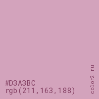 Цвет #D3A3BC в цветовой модели RGB обозначается тремя октетами (211, 163, 188) в десятичном формате и #D3A3BC в шестнадцатиричном (hex) формате, которые являются интенсивностью красного 211 (hex D3), интенсивность зелёного 163 (hex A3) и интенсивность синего 188 (hex BC).
