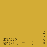 Цвет #D3AC35 в цветовой модели RGB обозначается тремя октетами (211, 172, 53) в десятичном формате и #D3AC35 в шестнадцатиричном (hex) формате, которые являются интенсивностью красного 211 (hex D3), интенсивность зелёного 172 (hex AC) и интенсивность синего 53 (hex 35).