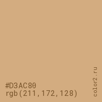 Цвет #D3AC80 в цветовой модели RGB обозначается тремя октетами (211, 172, 128) в десятичном формате и #D3AC80 в шестнадцатиричном (hex) формате, которые являются интенсивностью красного 211 (hex D3), интенсивность зелёного 172 (hex AC) и интенсивность синего 128 (hex 80).