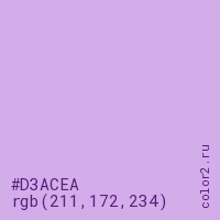 Цвет #D3ACEA в цветовой модели RGB обозначается тремя октетами (211, 172, 234) в десятичном формате и #D3ACEA в шестнадцатиричном (hex) формате, которые являются интенсивностью красного 211 (hex D3), интенсивность зелёного 172 (hex AC) и интенсивность синего 234 (hex EA).