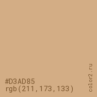 Цвет #D3AD85 в цветовой модели RGB обозначается тремя октетами (211, 173, 133) в десятичном формате и #D3AD85 в шестнадцатиричном (hex) формате, которые являются интенсивностью красного 211 (hex D3), интенсивность зелёного 173 (hex AD) и интенсивность синего 133 (hex 85).