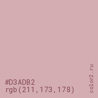 Цвет #D3ADB2 в цветовой модели RGB обозначается тремя октетами (211, 173, 178) в десятичном формате и #D3ADB2 в шестнадцатиричном (hex) формате, которые являются интенсивностью красного 211 (hex D3), интенсивность зелёного 173 (hex AD) и интенсивность синего 178 (hex B2).