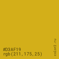 Цвет #D3AF19 в цветовой модели RGB обозначается тремя октетами (211, 175, 25) в десятичном формате и #D3AF19 в шестнадцатиричном (hex) формате, которые являются интенсивностью красного 211 (hex D3), интенсивность зелёного 175 (hex AF) и интенсивность синего 25 (hex 19).