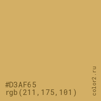 Цвет #D3AF65 в цветовой модели RGB обозначается тремя октетами (211, 175, 101) в десятичном формате и #D3AF65 в шестнадцатиричном (hex) формате, которые являются интенсивностью красного 211 (hex D3), интенсивность зелёного 175 (hex AF) и интенсивность синего 101 (hex 65).