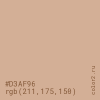 Цвет #D3AF96 в цветовой модели RGB обозначается тремя октетами (211, 175, 150) в десятичном формате и #D3AF96 в шестнадцатиричном (hex) формате, которые являются интенсивностью красного 211 (hex D3), интенсивность зелёного 175 (hex AF) и интенсивность синего 150 (hex 96).