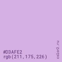 Цвет #D3AFE2 в цветовой модели RGB обозначается тремя октетами (211, 175, 226) в десятичном формате и #D3AFE2 в шестнадцатиричном (hex) формате, которые являются интенсивностью красного 211 (hex D3), интенсивность зелёного 175 (hex AF) и интенсивность синего 226 (hex E2).