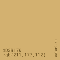 Цвет #D3B170 в цветовой модели RGB обозначается тремя октетами (211, 177, 112) в десятичном формате и #D3B170 в шестнадцатиричном (hex) формате, которые являются интенсивностью красного 211 (hex D3), интенсивность зелёного 177 (hex B1) и интенсивность синего 112 (hex 70).