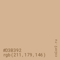 Цвет #D3B392 в цветовой модели RGB обозначается тремя октетами (211, 179, 146) в десятичном формате и #D3B392 в шестнадцатиричном (hex) формате, которые являются интенсивностью красного 211 (hex D3), интенсивность зелёного 179 (hex B3) и интенсивность синего 146 (hex 92).