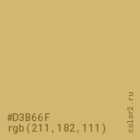 Цвет #D3B66F в цветовой модели RGB обозначается тремя октетами (211, 182, 111) в десятичном формате и #D3B66F в шестнадцатиричном (hex) формате, которые являются интенсивностью красного 211 (hex D3), интенсивность зелёного 182 (hex B6) и интенсивность синего 111 (hex 6F).