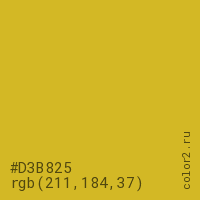 Цвет #D3B825 в цветовой модели RGB обозначается тремя октетами (211, 184, 37) в десятичном формате и #D3B825 в шестнадцатиричном (hex) формате, которые являются интенсивностью красного 211 (hex D3), интенсивность зелёного 184 (hex B8) и интенсивность синего 37 (hex 25).