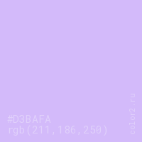 Цвет #D3BAFA в цветовой модели RGB обозначается тремя октетами (211, 186, 250) в десятичном формате и #D3BAFA в шестнадцатиричном (hex) формате, которые являются интенсивностью красного 211 (hex D3), интенсивность зелёного 186 (hex BA) и интенсивность синего 250 (hex FA).