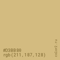 Цвет #D3BB80 в цветовой модели RGB обозначается тремя октетами (211, 187, 128) в десятичном формате и #D3BB80 в шестнадцатиричном (hex) формате, которые являются интенсивностью красного 211 (hex D3), интенсивность зелёного 187 (hex BB) и интенсивность синего 128 (hex 80).