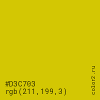 Цвет #D3C703 в цветовой модели RGB обозначается тремя октетами (211, 199, 3) в десятичном формате и #D3C703 в шестнадцатиричном (hex) формате, которые являются интенсивностью красного 211 (hex D3), интенсивность зелёного 199 (hex C7) и интенсивность синего 3 (hex 03).