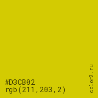 Цвет #D3CB02 в цветовой модели RGB обозначается тремя октетами (211, 203, 2) в десятичном формате и #D3CB02 в шестнадцатиричном (hex) формате, которые являются интенсивностью красного 211 (hex D3), интенсивность зелёного 203 (hex CB) и интенсивность синего 2 (hex 02).