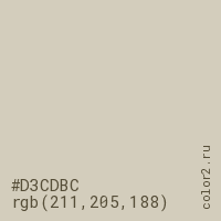 Цвет #D3CDBC в цветовой модели RGB обозначается тремя октетами (211, 205, 188) в десятичном формате и #D3CDBC в шестнадцатиричном (hex) формате, которые являются интенсивностью красного 211 (hex D3), интенсивность зелёного 205 (hex CD) и интенсивность синего 188 (hex BC).