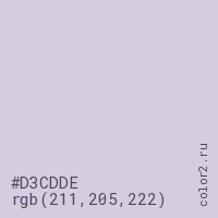 Цвет #D3CDDE в цветовой модели RGB обозначается тремя октетами (211, 205, 222) в десятичном формате и #D3CDDE в шестнадцатиричном (hex) формате, которые являются интенсивностью красного 211 (hex D3), интенсивность зелёного 205 (hex CD) и интенсивность синего 222 (hex DE).