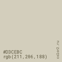 Цвет #D3CEBC в цветовой модели RGB обозначается тремя октетами (211, 206, 188) в десятичном формате и #D3CEBC в шестнадцатиричном (hex) формате, которые являются интенсивностью красного 211 (hex D3), интенсивность зелёного 206 (hex CE) и интенсивность синего 188 (hex BC).