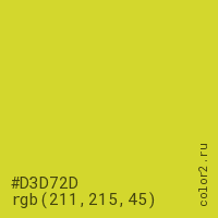 Цвет #D3D72D в цветовой модели RGB обозначается тремя октетами (211, 215, 45) в десятичном формате и #D3D72D в шестнадцатиричном (hex) формате, которые являются интенсивностью красного 211 (hex D3), интенсивность зелёного 215 (hex D7) и интенсивность синего 45 (hex 2D).