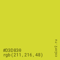 Цвет #D3D830 в цветовой модели RGB обозначается тремя октетами (211, 216, 48) в десятичном формате и #D3D830 в шестнадцатиричном (hex) формате, которые являются интенсивностью красного 211 (hex D3), интенсивность зелёного 216 (hex D8) и интенсивность синего 48 (hex 30).