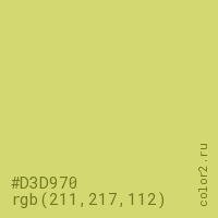 Цвет #D3D970 в цветовой модели RGB обозначается тремя октетами (211, 217, 112) в десятичном формате и #D3D970 в шестнадцатиричном (hex) формате, которые являются интенсивностью красного 211 (hex D3), интенсивность зелёного 217 (hex D9) и интенсивность синего 112 (hex 70).