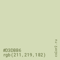 Цвет #D3DBB6 в цветовой модели RGB обозначается тремя октетами (211, 219, 182) в десятичном формате и #D3DBB6 в шестнадцатиричном (hex) формате, которые являются интенсивностью красного 211 (hex D3), интенсивность зелёного 219 (hex DB) и интенсивность синего 182 (hex B6).