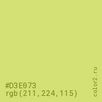 Цвет #D3E073 в цветовой модели RGB обозначается тремя октетами (211, 224, 115) в десятичном формате и #D3E073 в шестнадцатиричном (hex) формате, которые являются интенсивностью красного 211 (hex D3), интенсивность зелёного 224 (hex E0) и интенсивность синего 115 (hex 73).