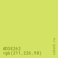 Цвет #D3E262 в цветовой модели RGB обозначается тремя октетами (211, 226, 98) в десятичном формате и #D3E262 в шестнадцатиричном (hex) формате, которые являются интенсивностью красного 211 (hex D3), интенсивность зелёного 226 (hex E2) и интенсивность синего 98 (hex 62).