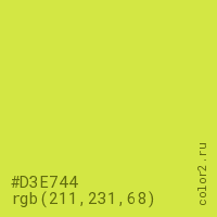 Цвет #D3E744 в цветовой модели RGB обозначается тремя октетами (211, 231, 68) в десятичном формате и #D3E744 в шестнадцатиричном (hex) формате, которые являются интенсивностью красного 211 (hex D3), интенсивность зелёного 231 (hex E7) и интенсивность синего 68 (hex 44).
