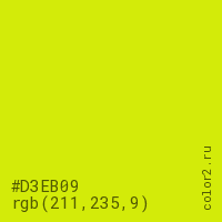 Цвет #D3EB09 в цветовой модели RGB обозначается тремя октетами (211, 235, 9) в десятичном формате и #D3EB09 в шестнадцатиричном (hex) формате, которые являются интенсивностью красного 211 (hex D3), интенсивность зелёного 235 (hex EB) и интенсивность синего 9 (hex 09).