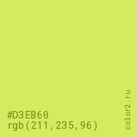 Цвет #D3EB60 в цветовой модели RGB обозначается тремя октетами (211, 235, 96) в десятичном формате и #D3EB60 в шестнадцатиричном (hex) формате, которые являются интенсивностью красного 211 (hex D3), интенсивность зелёного 235 (hex EB) и интенсивность синего 96 (hex 60).