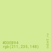 Цвет #D3EB94 в цветовой модели RGB обозначается тремя октетами (211, 235, 148) в десятичном формате и #D3EB94 в шестнадцатиричном (hex) формате, которые являются интенсивностью красного 211 (hex D3), интенсивность зелёного 235 (hex EB) и интенсивность синего 148 (hex 94).