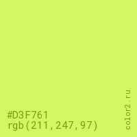 Цвет #D3F761 в цветовой модели RGB обозначается тремя октетами (211, 247, 97) в десятичном формате и #D3F761 в шестнадцатиричном (hex) формате, которые являются интенсивностью красного 211 (hex D3), интенсивность зелёного 247 (hex F7) и интенсивность синего 97 (hex 61).