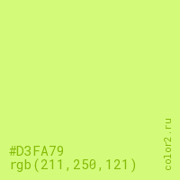 Цвет #D3FA79 в цветовой модели RGB обозначается тремя октетами (211, 250, 121) в десятичном формате и #D3FA79 в шестнадцатиричном (hex) формате, которые являются интенсивностью красного 211 (hex D3), интенсивность зелёного 250 (hex FA) и интенсивность синего 121 (hex 79).
