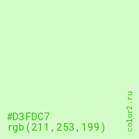 Цвет #D3FDC7 в цветовой модели RGB обозначается тремя октетами (211, 253, 199) в десятичном формате и #D3FDC7 в шестнадцатиричном (hex) формате, которые являются интенсивностью красного 211 (hex D3), интенсивность зелёного 253 (hex FD) и интенсивность синего 199 (hex C7).