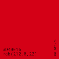 Цвет #D40016 в цветовой модели RGB обозначается тремя октетами (212, 0, 22) в десятичном формате и #D40016 в шестнадцатиричном (hex) формате, которые являются интенсивностью красного 212 (hex D4), интенсивность зелёного 0 (hex 00) и интенсивность синего 22 (hex 16).