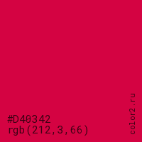 Цвет #D40342 в цветовой модели RGB обозначается тремя октетами (212, 3, 66) в десятичном формате и #D40342 в шестнадцатиричном (hex) формате, которые являются интенсивностью красного 212 (hex D4), интенсивность зелёного 3 (hex 03) и интенсивность синего 66 (hex 42).
