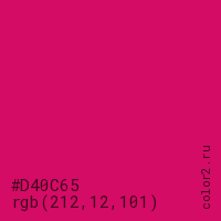 Цвет #D40C65 в цветовой модели RGB обозначается тремя октетами (212, 12, 101) в десятичном формате и #D40C65 в шестнадцатиричном (hex) формате, которые являются интенсивностью красного 212 (hex D4), интенсивность зелёного 12 (hex 0C) и интенсивность синего 101 (hex 65).