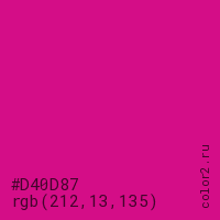 Цвет #D40D87 в цветовой модели RGB обозначается тремя октетами (212, 13, 135) в десятичном формате и #D40D87 в шестнадцатиричном (hex) формате, которые являются интенсивностью красного 212 (hex D4), интенсивность зелёного 13 (hex 0D) и интенсивность синего 135 (hex 87).