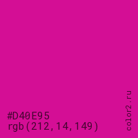 Цвет #D40E95 в цветовой модели RGB обозначается тремя октетами (212, 14, 149) в десятичном формате и #D40E95 в шестнадцатиричном (hex) формате, которые являются интенсивностью красного 212 (hex D4), интенсивность зелёного 14 (hex 0E) и интенсивность синего 149 (hex 95).