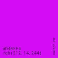 Цвет #D40EF4 в цветовой модели RGB обозначается тремя октетами (212, 14, 244) в десятичном формате и #D40EF4 в шестнадцатиричном (hex) формате, которые являются интенсивностью красного 212 (hex D4), интенсивность зелёного 14 (hex 0E) и интенсивность синего 244 (hex F4).