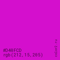 Цвет #D40FCD в цветовой модели RGB обозначается тремя октетами (212, 15, 205) в десятичном формате и #D40FCD в шестнадцатиричном (hex) формате, которые являются интенсивностью красного 212 (hex D4), интенсивность зелёного 15 (hex 0F) и интенсивность синего 205 (hex CD).