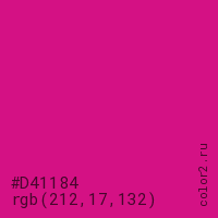 Цвет #D41184 в цветовой модели RGB обозначается тремя октетами (212, 17, 132) в десятичном формате и #D41184 в шестнадцатиричном (hex) формате, которые являются интенсивностью красного 212 (hex D4), интенсивность зелёного 17 (hex 11) и интенсивность синего 132 (hex 84).