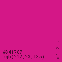 Цвет #D41787 в цветовой модели RGB обозначается тремя октетами (212, 23, 135) в десятичном формате и #D41787 в шестнадцатиричном (hex) формате, которые являются интенсивностью красного 212 (hex D4), интенсивность зелёного 23 (hex 17) и интенсивность синего 135 (hex 87).