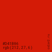 Цвет #D41B06 в цветовой модели RGB обозначается тремя октетами (212, 27, 6) в десятичном формате и #D41B06 в шестнадцатиричном (hex) формате, которые являются интенсивностью красного 212 (hex D4), интенсивность зелёного 27 (hex 1B) и интенсивность синего 6 (hex 06).