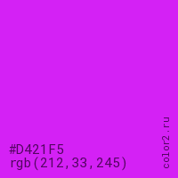 Цвет #D421F5 в цветовой модели RGB обозначается тремя октетами (212, 33, 245) в десятичном формате и #D421F5 в шестнадцатиричном (hex) формате, которые являются интенсивностью красного 212 (hex D4), интенсивность зелёного 33 (hex 21) и интенсивность синего 245 (hex F5).