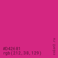 Цвет #D42681 в цветовой модели RGB обозначается тремя октетами (212, 38, 129) в десятичном формате и #D42681 в шестнадцатиричном (hex) формате, которые являются интенсивностью красного 212 (hex D4), интенсивность зелёного 38 (hex 26) и интенсивность синего 129 (hex 81).