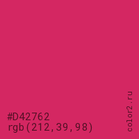 Цвет #D42762 в цветовой модели RGB обозначается тремя октетами (212, 39, 98) в десятичном формате и #D42762 в шестнадцатиричном (hex) формате, которые являются интенсивностью красного 212 (hex D4), интенсивность зелёного 39 (hex 27) и интенсивность синего 98 (hex 62).