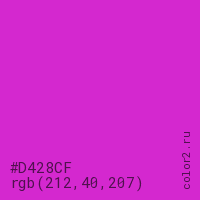 Цвет #D428CF в цветовой модели RGB обозначается тремя октетами (212, 40, 207) в десятичном формате и #D428CF в шестнадцатиричном (hex) формате, которые являются интенсивностью красного 212 (hex D4), интенсивность зелёного 40 (hex 28) и интенсивность синего 207 (hex CF).
