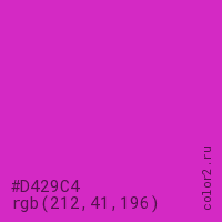 Цвет #D429C4 в цветовой модели RGB обозначается тремя октетами (212, 41, 196) в десятичном формате и #D429C4 в шестнадцатиричном (hex) формате, которые являются интенсивностью красного 212 (hex D4), интенсивность зелёного 41 (hex 29) и интенсивность синего 196 (hex C4).