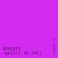 Цвет #D42BF2 в цветовой модели RGB обозначается тремя октетами (212, 43, 242) в десятичном формате и #D42BF2 в шестнадцатиричном (hex) формате, которые являются интенсивностью красного 212 (hex D4), интенсивность зелёного 43 (hex 2B) и интенсивность синего 242 (hex F2).